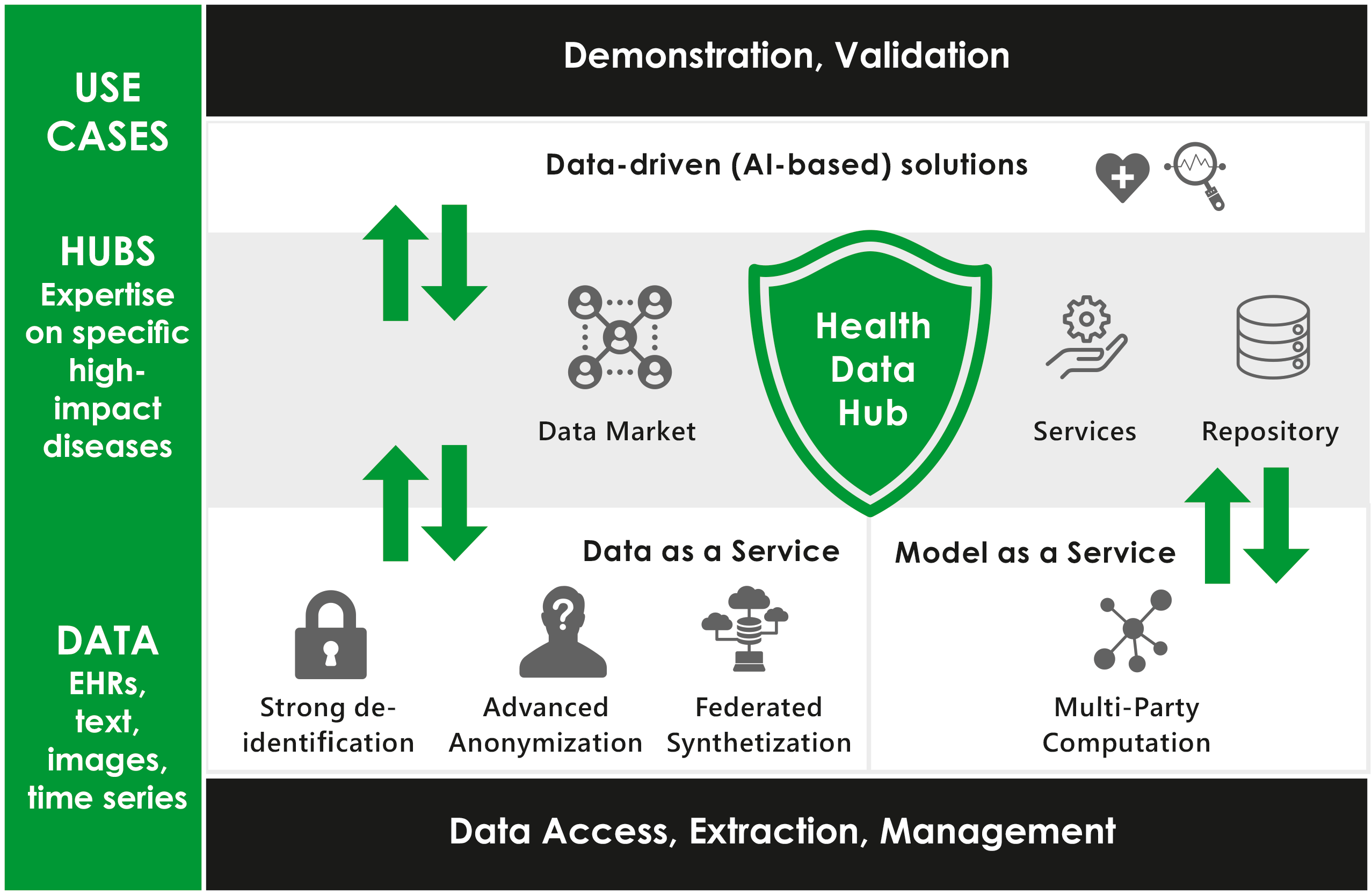 Therefore, PHASE IV AI follows an agile integrated approach developing (1) data synthetization services (DaaS), (2) multi-party computation services (MaaS), and (3) a Health Data Hub. Underlying to these developments, innovative tools for in-situ data extraction, data management, e.g. filtering, cleansing, and joining, shall be utilized. The development of PHASE IV AI will setup upon clinical data environments across several European regions – Scandinavia, Central Europe, Western Europe, and the United Kingdom. This way a wide variety of data can be accessed as well as a broad validation of the developed tools and services along diverse work environments and professional user groups is ensured.